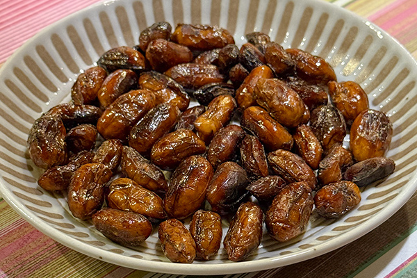 - 1、を一旦取り出し、水と砂糖をフライパンに入れ、泡が出てきたら再び落花生を加えて弱火で10分ほどからめる。