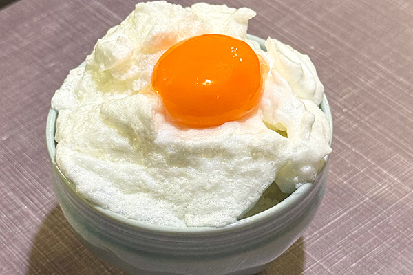 ご飯の上にメレンゲをのせ、中央に黄身をのせて完成です。