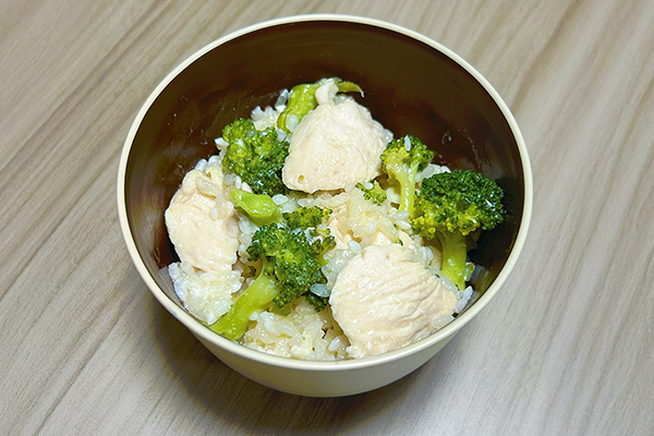 - 炊飯器の内釜に1.とBを入れ、水を2合の目盛りまで加えて混ぜる。その上に鶏肉をまんべんなくのせ、さらにブロッコリーをのせて、炊飯する。早炊きや炊き込みごはんのコースがあればそちらでもOK。