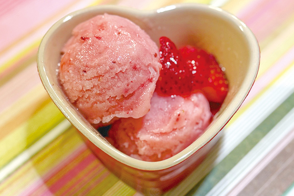 ミキサーで撹拌しすぎないこと。いちごの粒が残っているくらいで止めると、いちごの食感が残る仕上がりに。